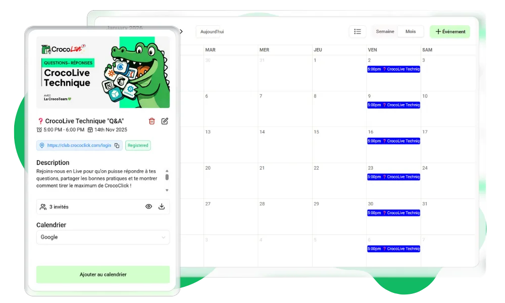 Planifiez vos événements, vos lives et vos sessions de groupe avec rappels automatiques et affichage selon la timezone.