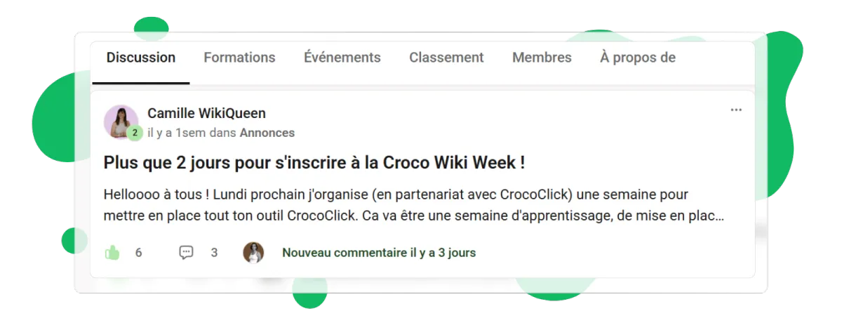Un espace clair et moderne - organisé par canal - pour poster, commenter, réagir, partager des médias et créer un engagement naturel.