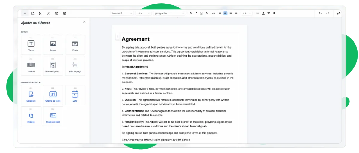 Créez des propositions commerciales et des factures au design impeccable sans toucher à Word. Glissez-déposez vos blocs, ajoutez votre branding et transformez vos devis en véritables pages de vente.